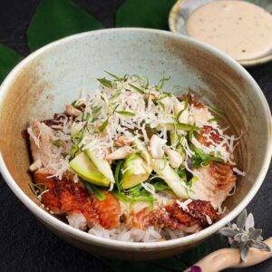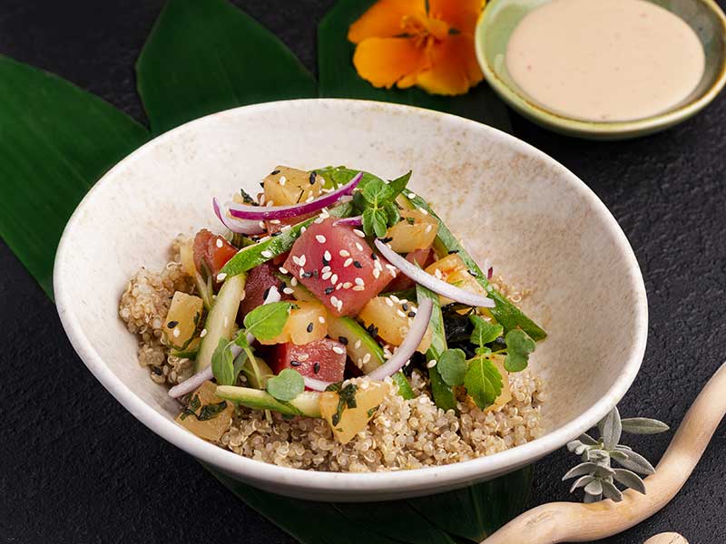 Рис, Ананас, Водоросли вакаме, Лук красный, Мята, Соус трюфельный, Соус ширача, Огурец, Тунец