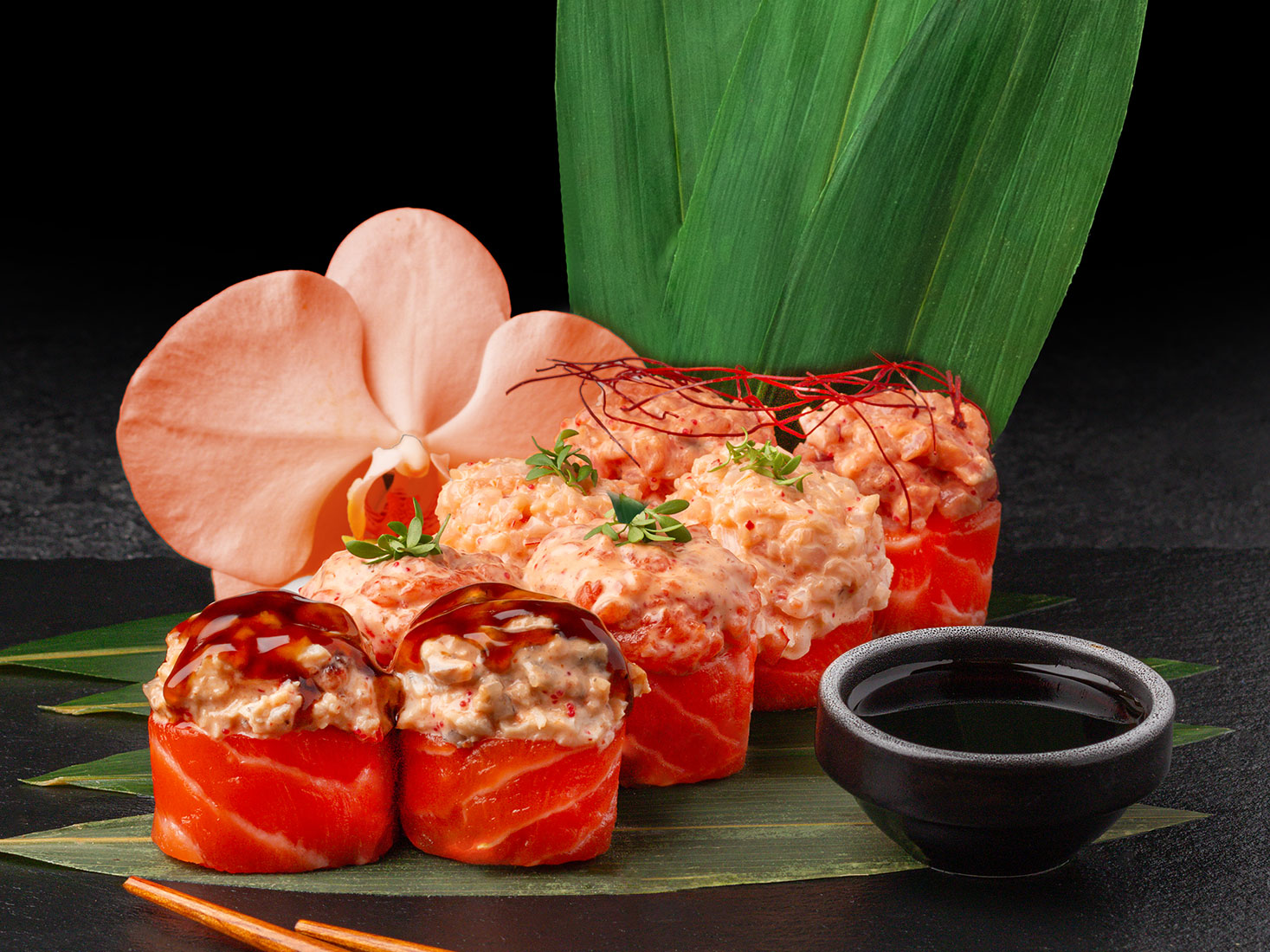рис, лосось, угорь, тунец, креветки, соус свит спайси, соус терияки, нити чили