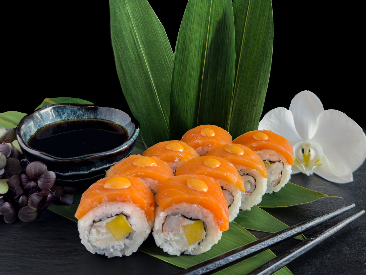 рис, копченый лосось, креветка, сыр, манго, соус спайси