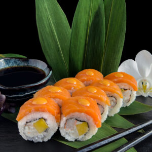 рис, копченый лосось, креветка, сыр, манго, соус спайси